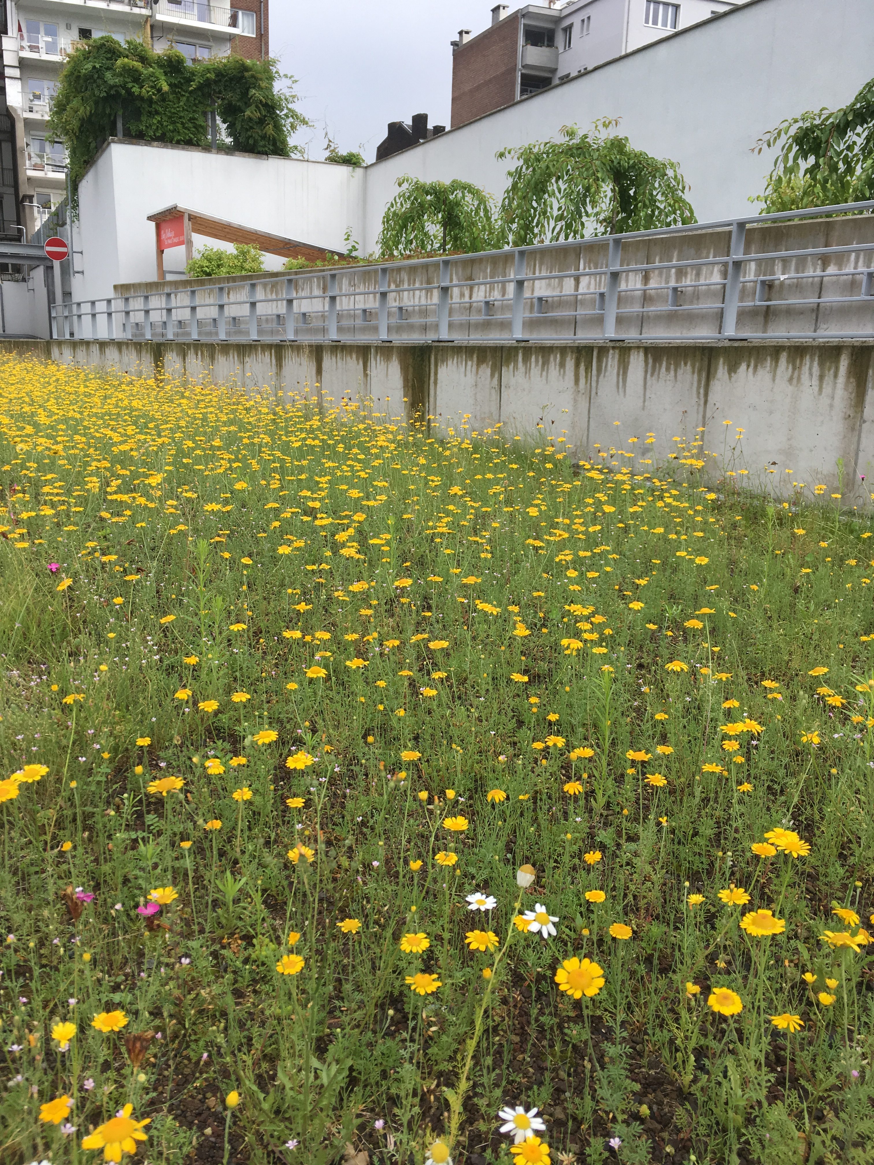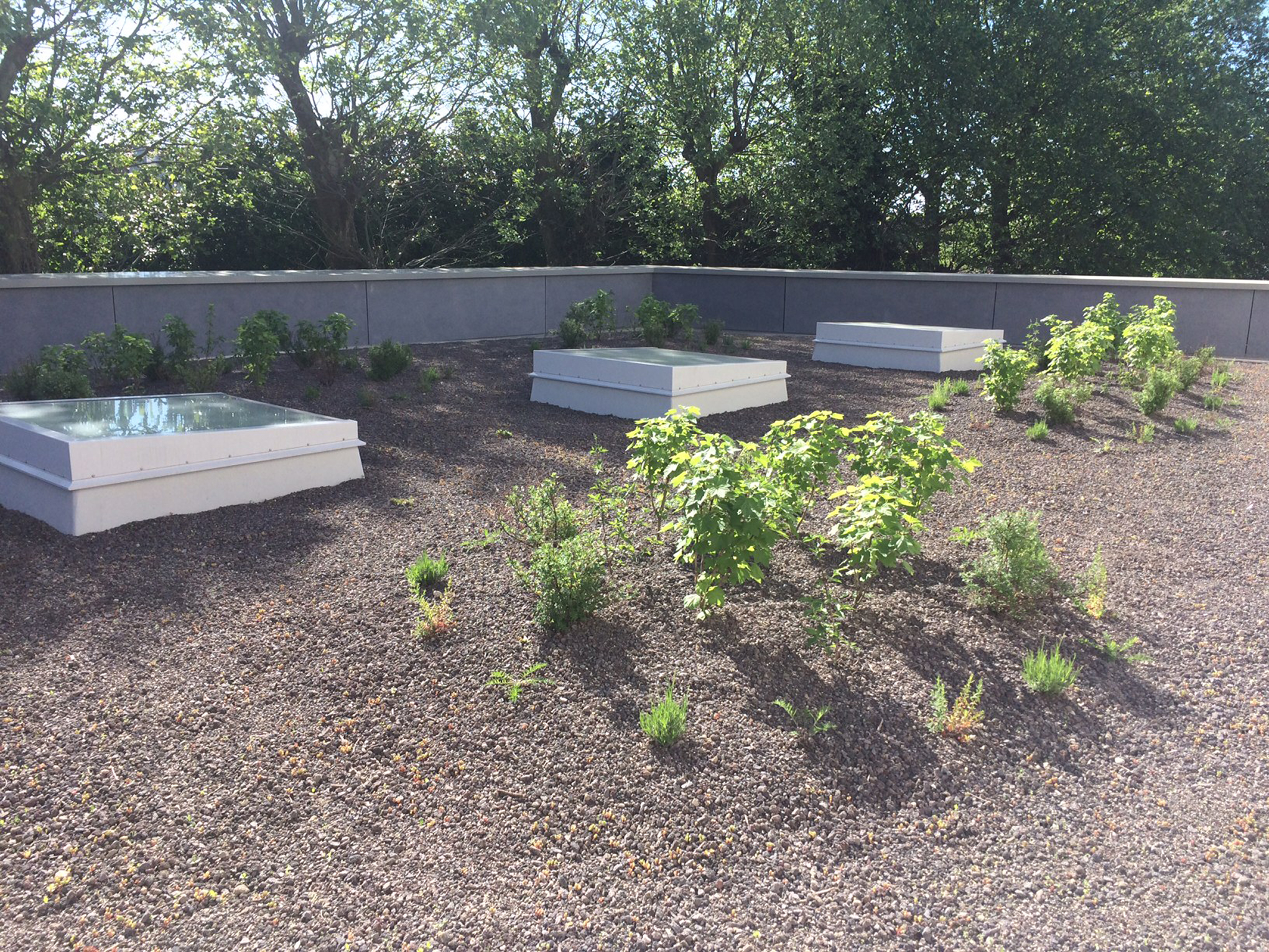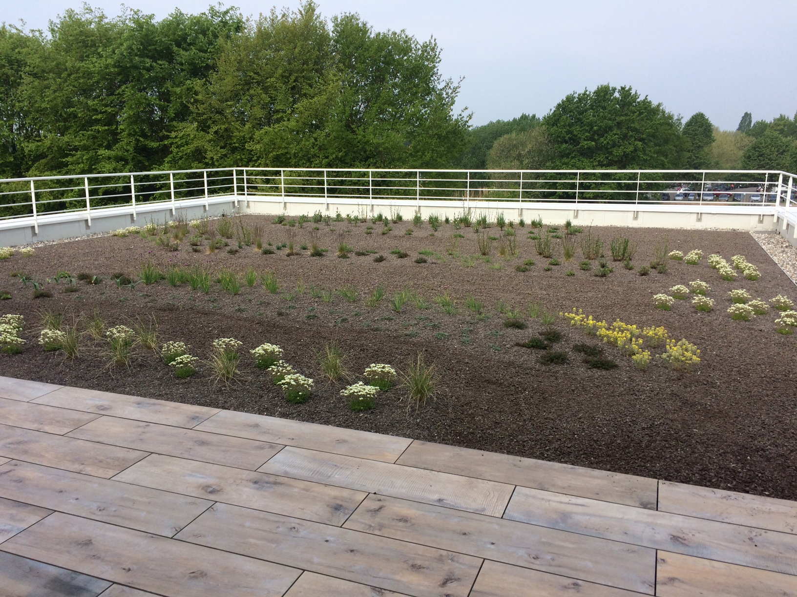 La toiture semi-intensive propose une grande diversité de végétaux (sédums, herbes aromatiques, graminées, plantes vivaces) avec entre autres la possibilité d’implanter de petits massifs d’arbustes. Elle fait la transition entre les toitures végétales extensives et intensives (toitures jardin).